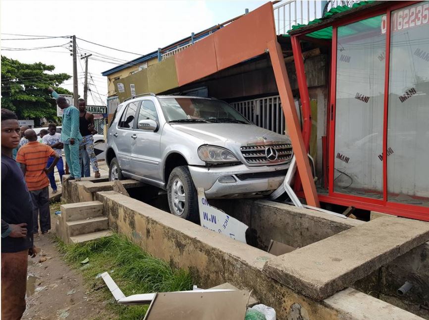 A freak and ghastly motor accident happened this afternoon in Lagos State due to break failure. A man who was driving the Mercedes-Benz 4Matic car - lost control of the vehicle and almost crashed into some shops.