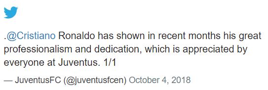 In a tweet, Juventus said: "Cristiano Ronaldo has shown in recent months his great professionalism and dedication, which is appreciated by everyone at Juventus."