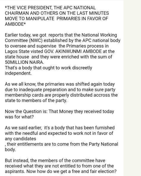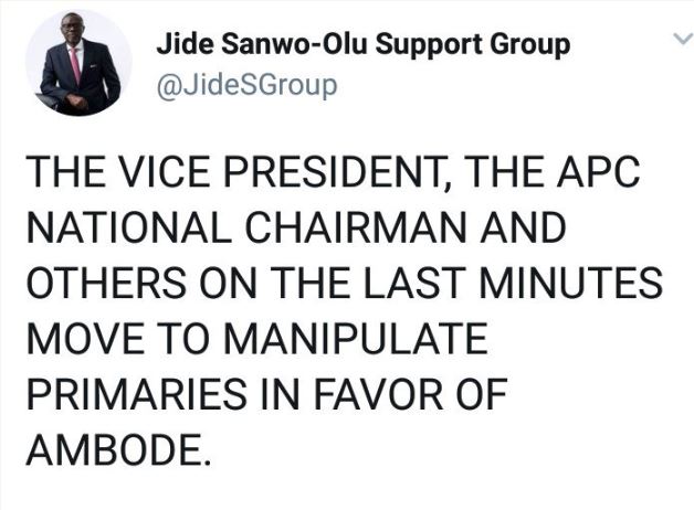 The campaign group of Babajide Sanwo-Olu - Jide Sanwo-Olu Support Group has accused the National Chairman of the ruling All Progressives Congress Congress, Adams Oshiomhole, Vice President Yemi Osinbajo and others of making last minute moves to rig the Lagos State governorship primaries in the favour of Governor Akinwunmi Ambode.