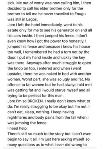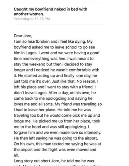 Relationship blogger and relationship adviser, Joro Olumofin has shared the story of a lady whose boyfriend cheated.