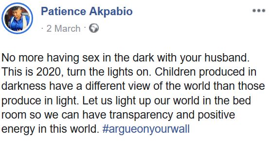 A Nigerian gospel singer has told women to stop having s*x with their husbands in the dark, following up with her reasons. |