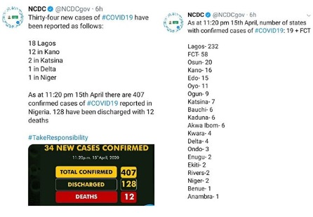 Nigeria has recorded another 34 new cases of Coronavirus, with the total figures jumping to 407. According to the Nigerian Centre for Disease Control, NCDC, 18 of the 34 cases were recorded in Lagos. Twelve cases were also recorded in Kano, two in Katsina, one in Delta and one in Niger. “Thirty-four new cases of #COVID19 have been reported as follows: 18 in Lagos, 12 in Kano, 2 in Katsina, 1 in Delta and 1 in Niger. “As at 11:20 pm 15th April there are 407 confirmed cases of #COVID19 reported in Nigeria. 128 have been discharged with 12 deaths,” NCDC said on its twitter handle. ![]() |