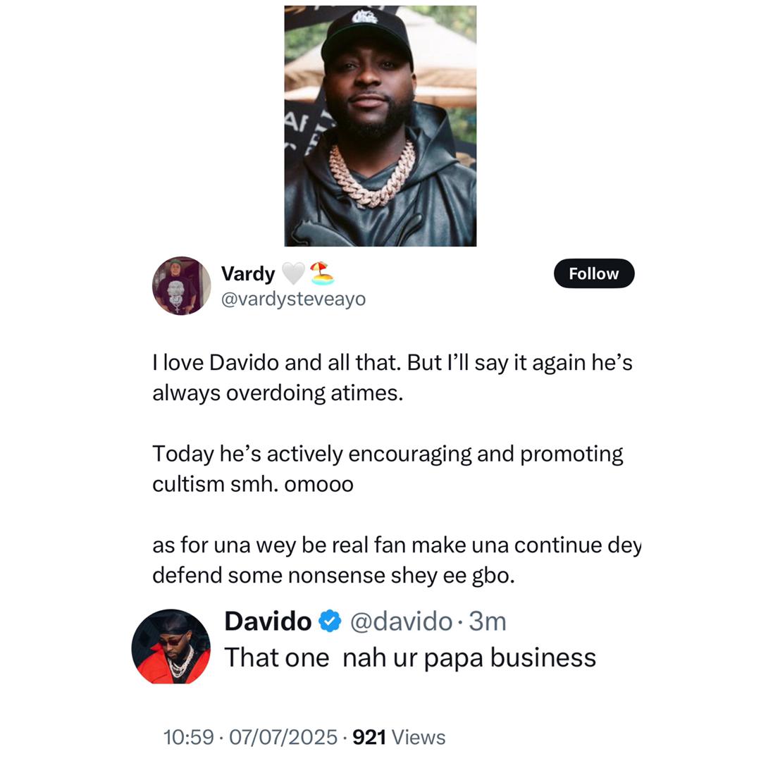 The fan, who says he’s a supporter of the singer, expressed disappointment, stating that Davido was “overdoing” and “actively encouraging and promoting cultism.”