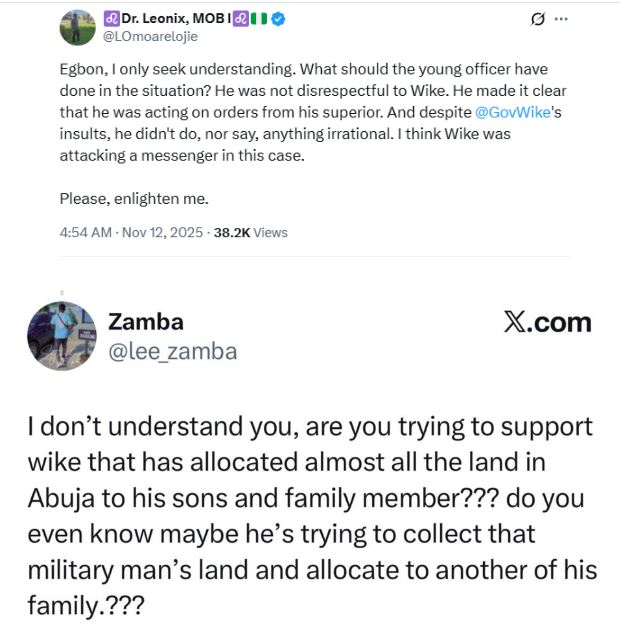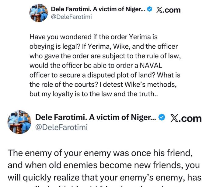 ‘’Have you wondered if the order Yerima is obeying is legal? If Yerima, Wike, and the officer who gave the order are subject to the rule of law, would the officer be able to order a NAVAL officer to secure a disputed plot of land? What is the role of the courts? I detest Wike’s methods, but my loyalty is to the law and the truth..''he wrote